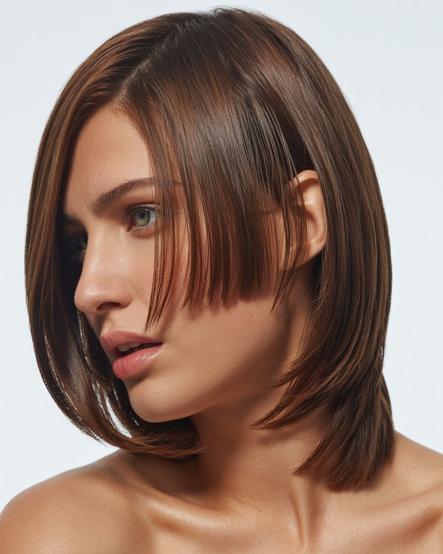 El flequillo largo lateral aporta un toque sofisticado y elegante a los cortes medios. Este estilo alarga visualmente el rostro y suaviza los ángulos. Es ideal para quienes quieren un look refinado con movimiento natural. Además, el flequillo lateral puede integrarse fácilmente con capas largas, aportando versatilidad. Perfecto para contextos formales y casuales por igual.